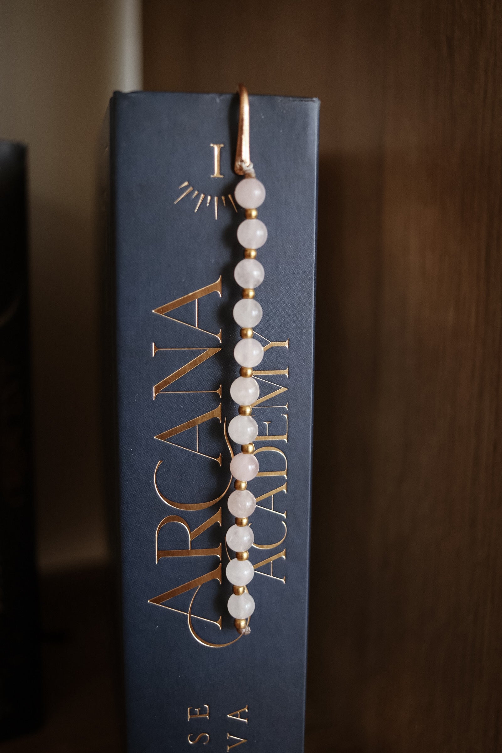 Lesezeichen mit Rosenquarz Perlen und Messing Perlen